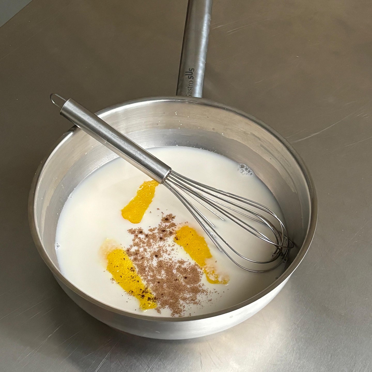 Whisk cornstarch, 100g sugar, salt, vanilla and almond milk in a sauce pan until smooth. Add the lemon peel.